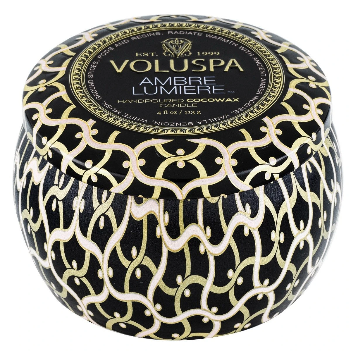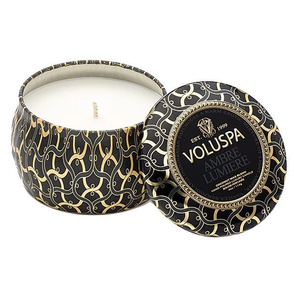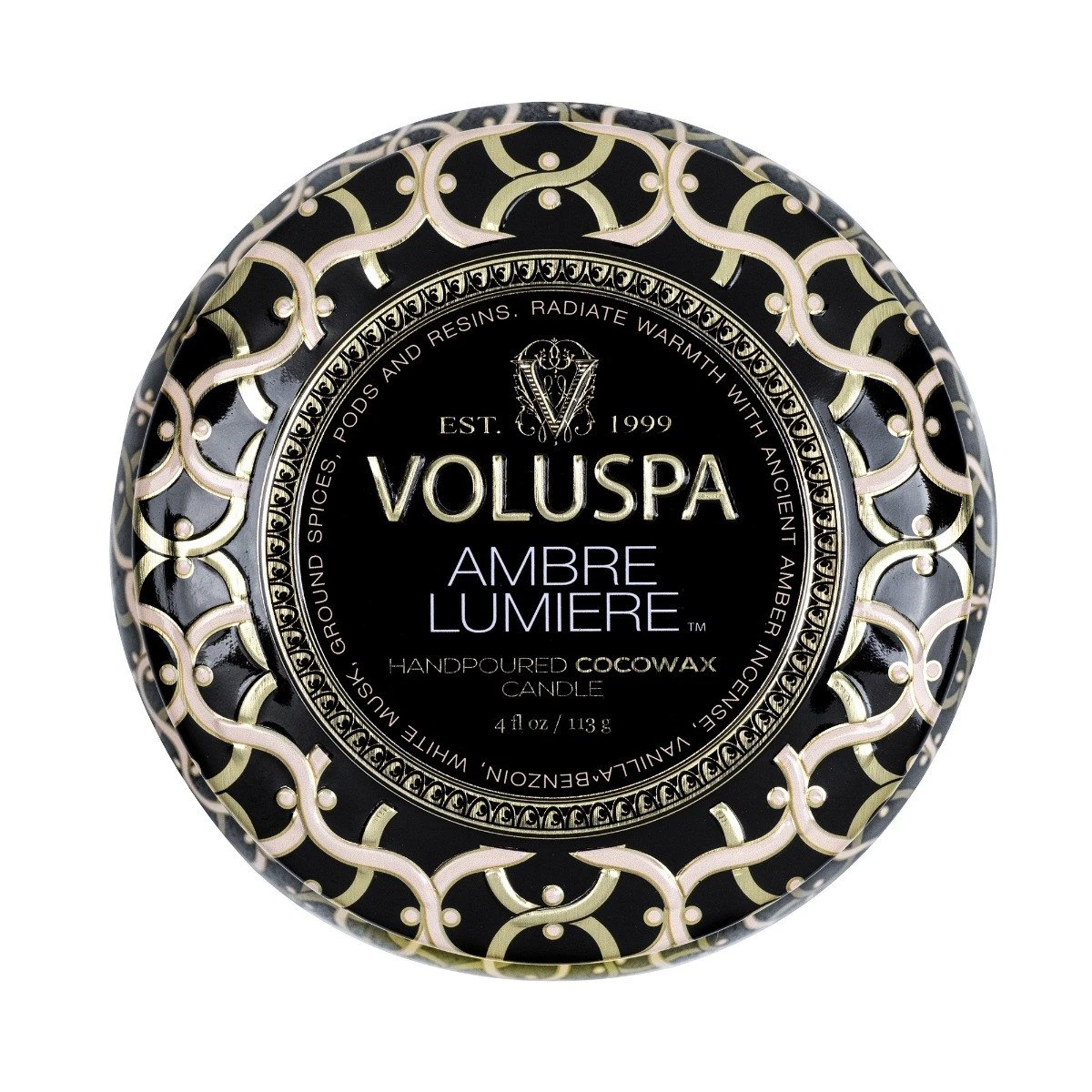 Voluspa Ambre Lumiere Mini Tin Candle: The aromatic radiance of this timeless scent instills a sense of calm, welcome and wellbeing. Reflect warmth in home and in spirit with Ambre Lumiere’s mystical, meditative blend – based on ancient amber incense, precious ceremonial burning wood, ground spices, pods and resins. Arouse the senses and soothe the soul.