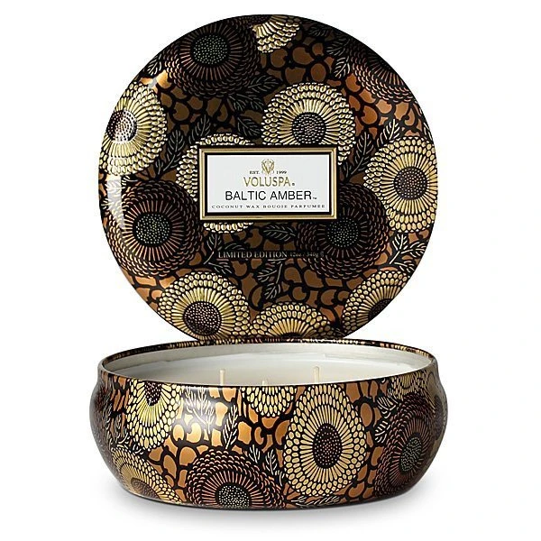 Voluspa Baltic Amber 3 Wick Tin Candle is warming up the ambiance with a sensual soirée of honeyed Amber Resin, velvety Woods and the rich incense of smoldering Vanilla Orchid. Bask in the swoon-worthy golden glow that radiates lingering warmth. Fall under Baltic Amber’s spell and prepare to be enchanted.