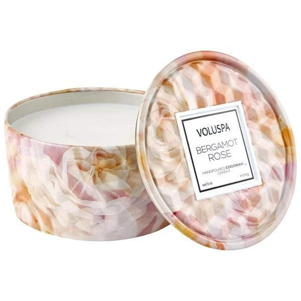 Voluspa Bergamot Rose Oud 2 Wick Tin Candle is tart green bergamot, yellow garden roses and orange flower.