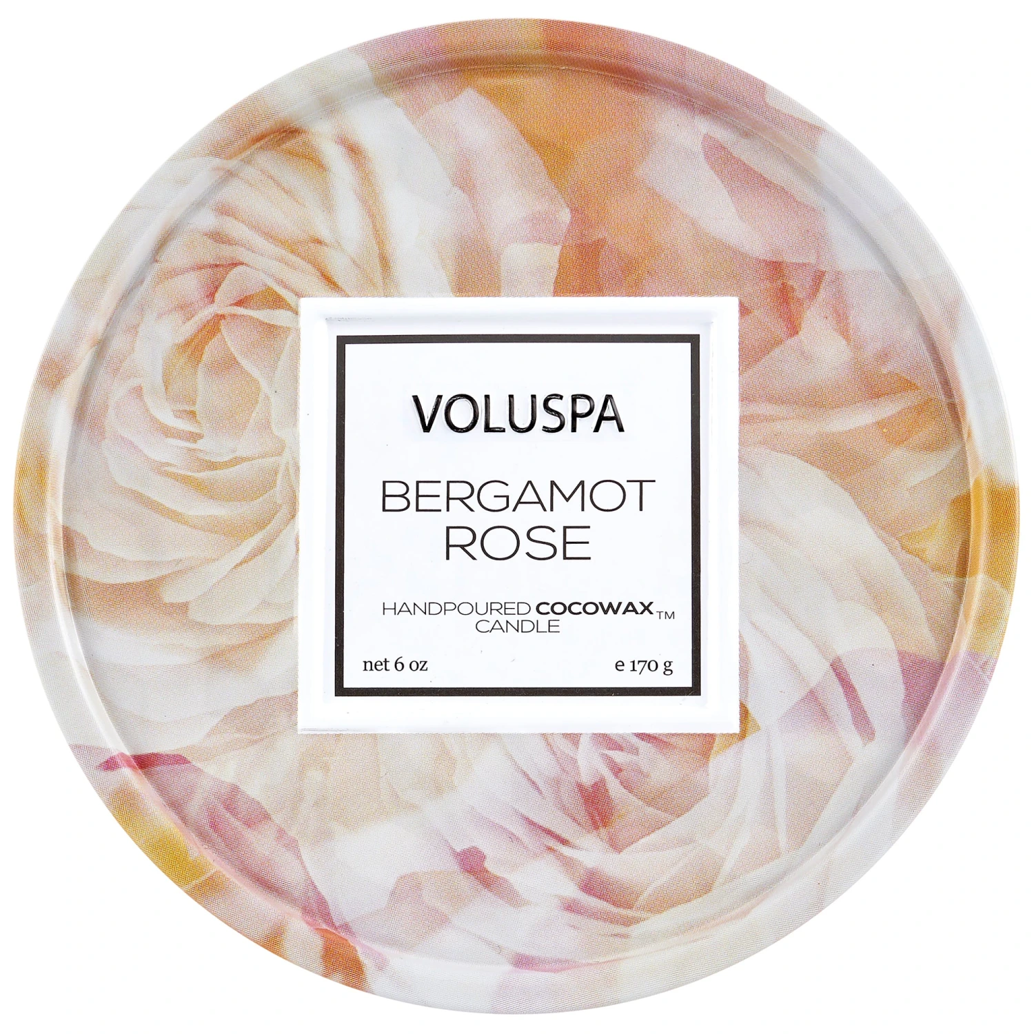 A tin candle completely embossed with a 3D geometric cube pattern and packaged to match the rose-inspired fragrance.