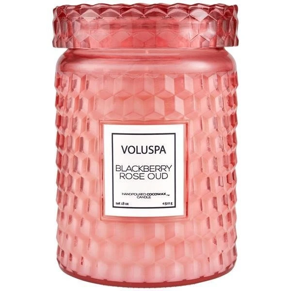 Voluspa Blackberry Rose Oud Embossed Glass Candle combines notes of Blackberry, Chypre, Rose & Oud.