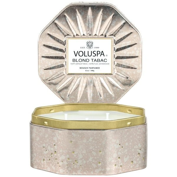 Voluspa Vermeil 12.7 oz. Octagon Tin Candle has a 2-wick configuration complete with decorative snuff lid to help keep the creamy coconut wax dust-free when not in use. This elegant container gets a second life when used for flowers or trinkets when candle is gone. Made with no phthalates, parabens, sulfates and are not tested on animals.