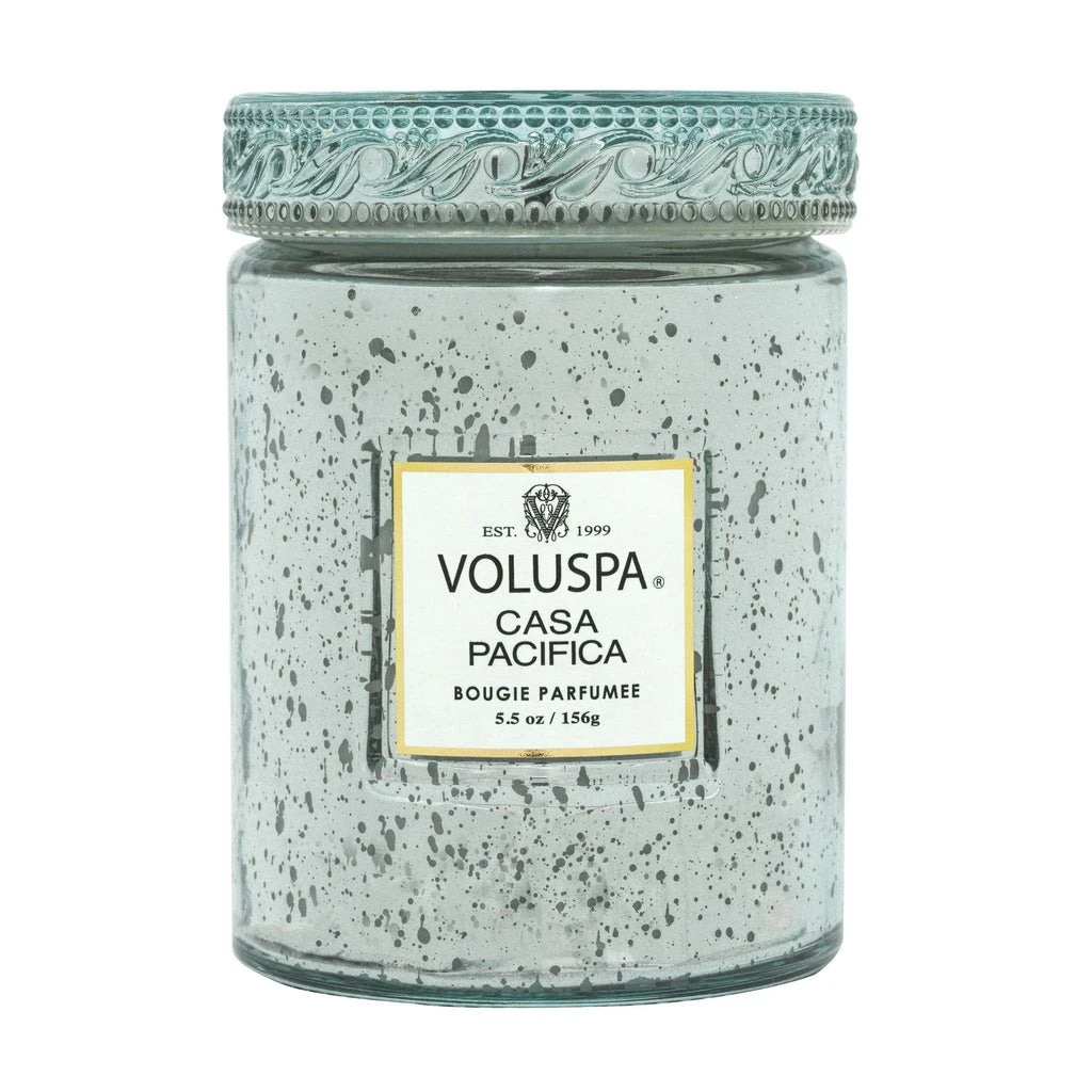 Voluspa Casa Pacifica Embossed Small Glass Candle: Under a cloudless, sunny, blue sky, waves roll in and out along a seemingly endless shoreline. Surfers glide into shore effortlessly. A gentle marine breeze fills the wide-open windows of a small beach house and caresses it with the scent of Sea Salt, California Driftwood and Shore Brush. Get a California beach house vibe anytime, anywhere- feel the sand in your toes and breeze in your hair. Hold the candle to your ear, listen carefully- and you just might hear the tide rolling in…