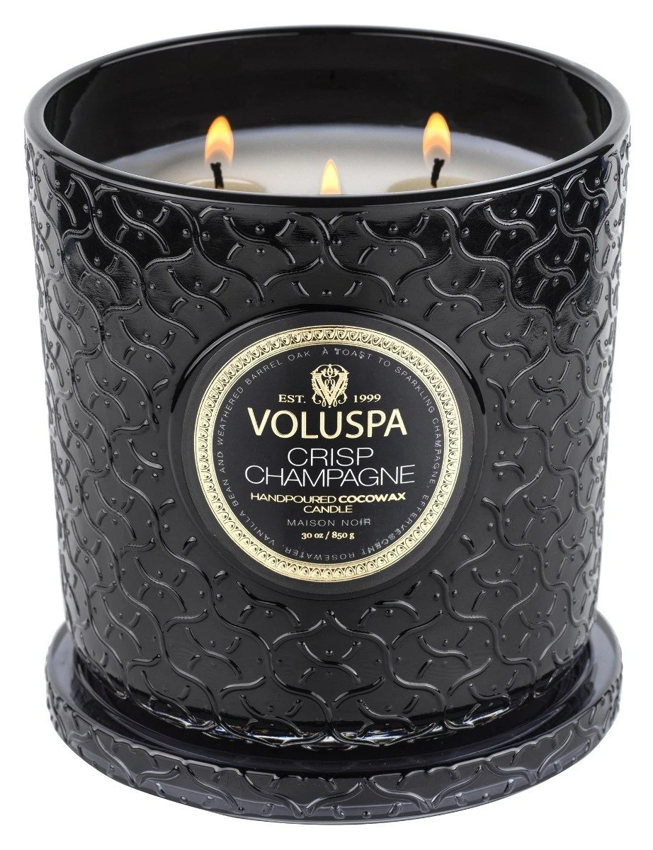 There is no shortage of luxury in our Maison Luxe Jar Candle. Voluspa’s signature Maison pattern wraps the vessel in an elegant emboss from base to lid. The triple wick configuration transforms the ambience with its reflective glow, creating a generous wax pool to ensure abundant fragrance throw. As a finishing touch, the candle is perfectly designed to fit in the depression of the lid when lit.