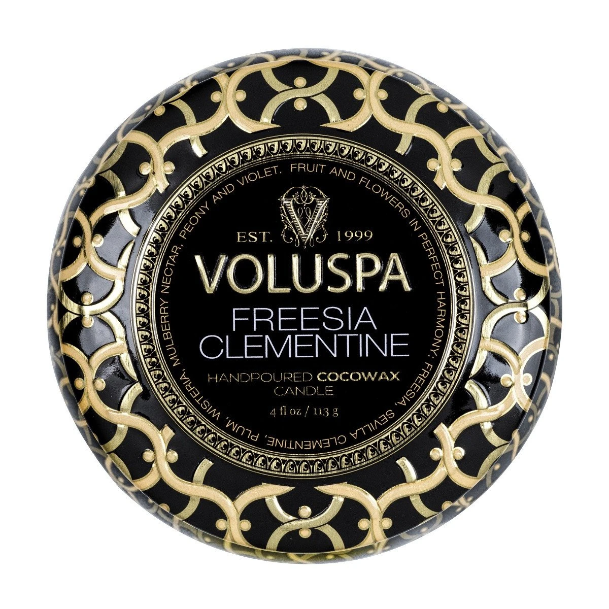 Voluspa Freesia Clementine Mini Tin Candle’s performance opens with the vibrant harmony of illustrious Sevilla clementine, mulberry nectar and California plum. Their fruit tones are joined in chorus by freesia, pink wisteria and Chinese peony – enhanced by the masterful composition of blue lotus, mirabelle and violet, each adding classic color to the blossoming melody.