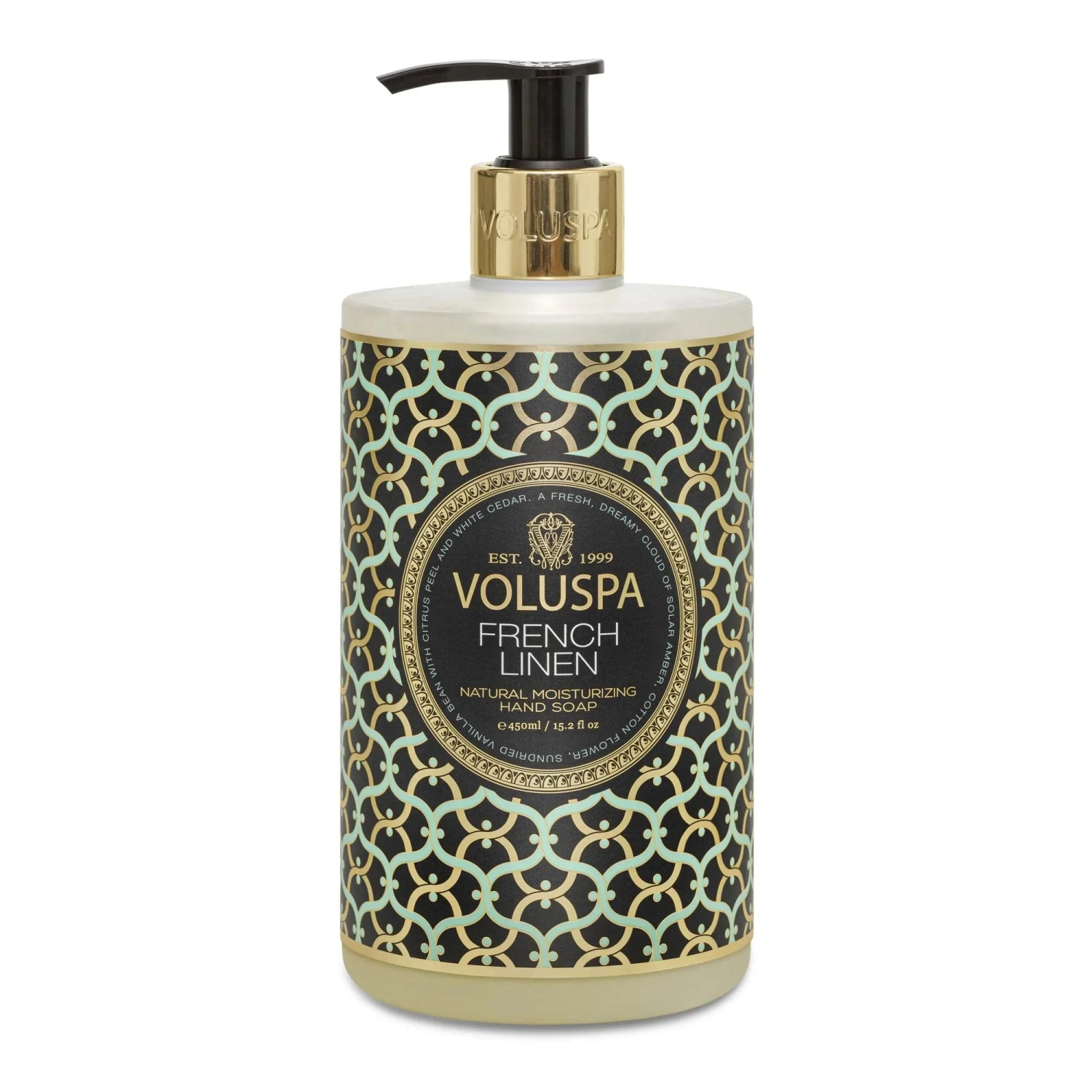 Voluspa’s Moisturizing Hand Soap is highly covetable with its elegant frosted soft-touch finished bottle, wrapped in classic black or white Maison artwork. Pops of distinctive secondary color highlights are coupled with accents of muted gold. An added touch of luxury is also present in the custom logo, embossed on chrome gold collars on all bottle necks. Each bottle is custom designed in-house and created with Post-Consumer Recycled material. The perfect balance of beauty and function, from our house to your home.