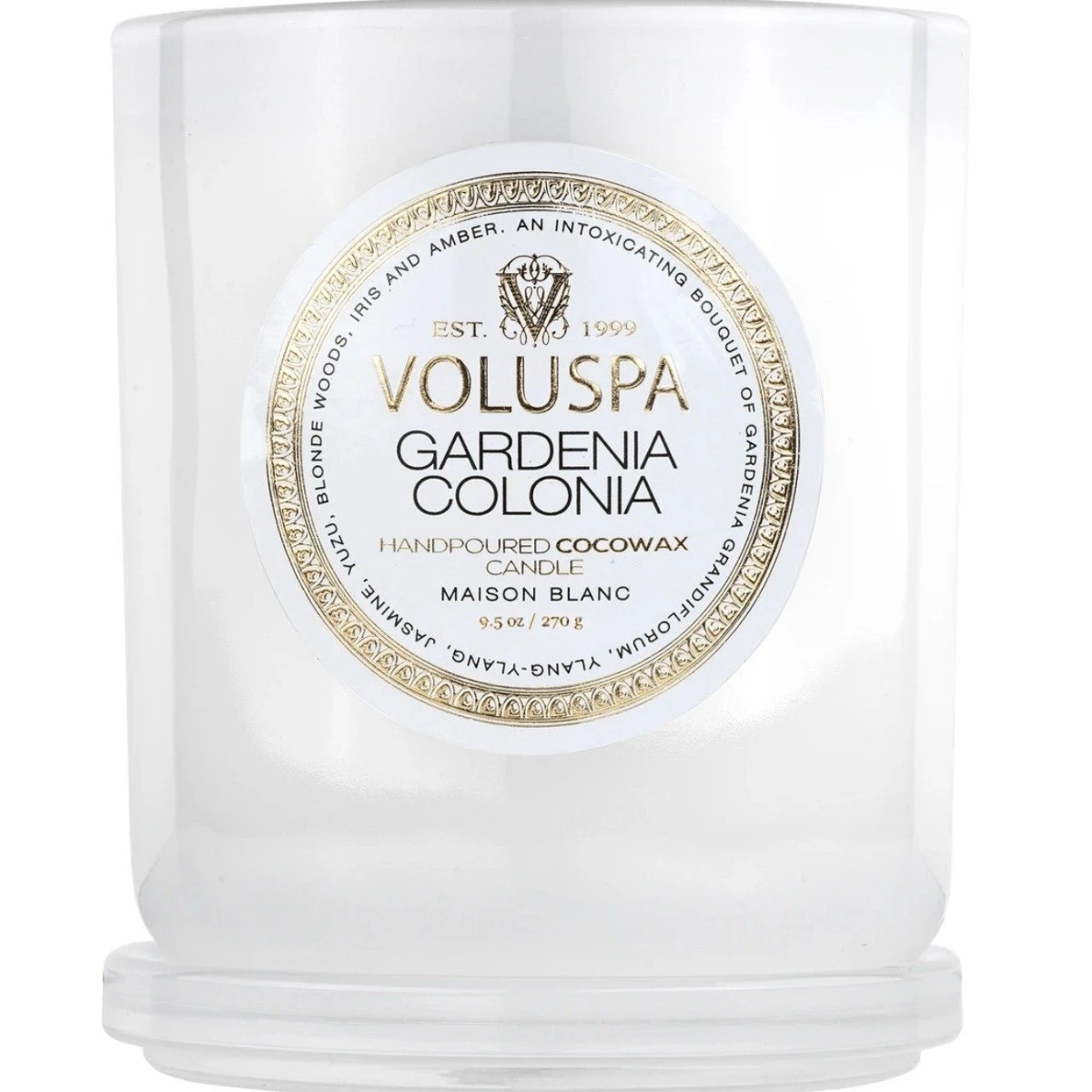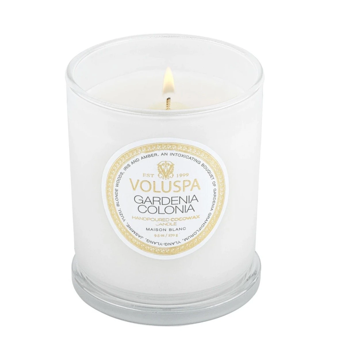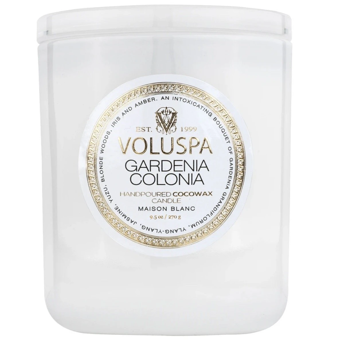 Voluspa Gardenia Colonia Candle:Â Heady, exotic gardenia grandiflorum opens its creamy petals of wild hearts to night blooming jasmine and iris. Vapors of blonde wood and amber mingle with this intoxicating floral bouquet – creating a sultry, fragrant cloud so smooth, the beauty and power of its velvety aroma seems dreamlike.