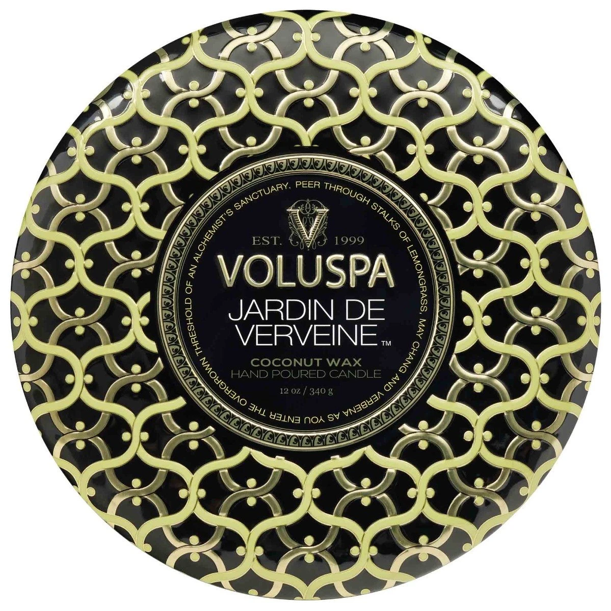 Voluspa Jardin de Verveine 3 Wick Tin Candle is peering through stalks of lemongrass and verbena as you enter the overgrown threshold of an alchemist’s sanctuary. As you soak in your surroundings, a zesty citrus and herbal accord cultivate your curiosity and enlighten your spirit. Stimulate your senses with notes of lemon, may chang and lemongrass. Softened with a heart of verbena, lime, geranium and a hint of jasmine. Your thoughts and energy are suddenly refreshed by green anise notes and a flash of mint. This is where the magic happens…