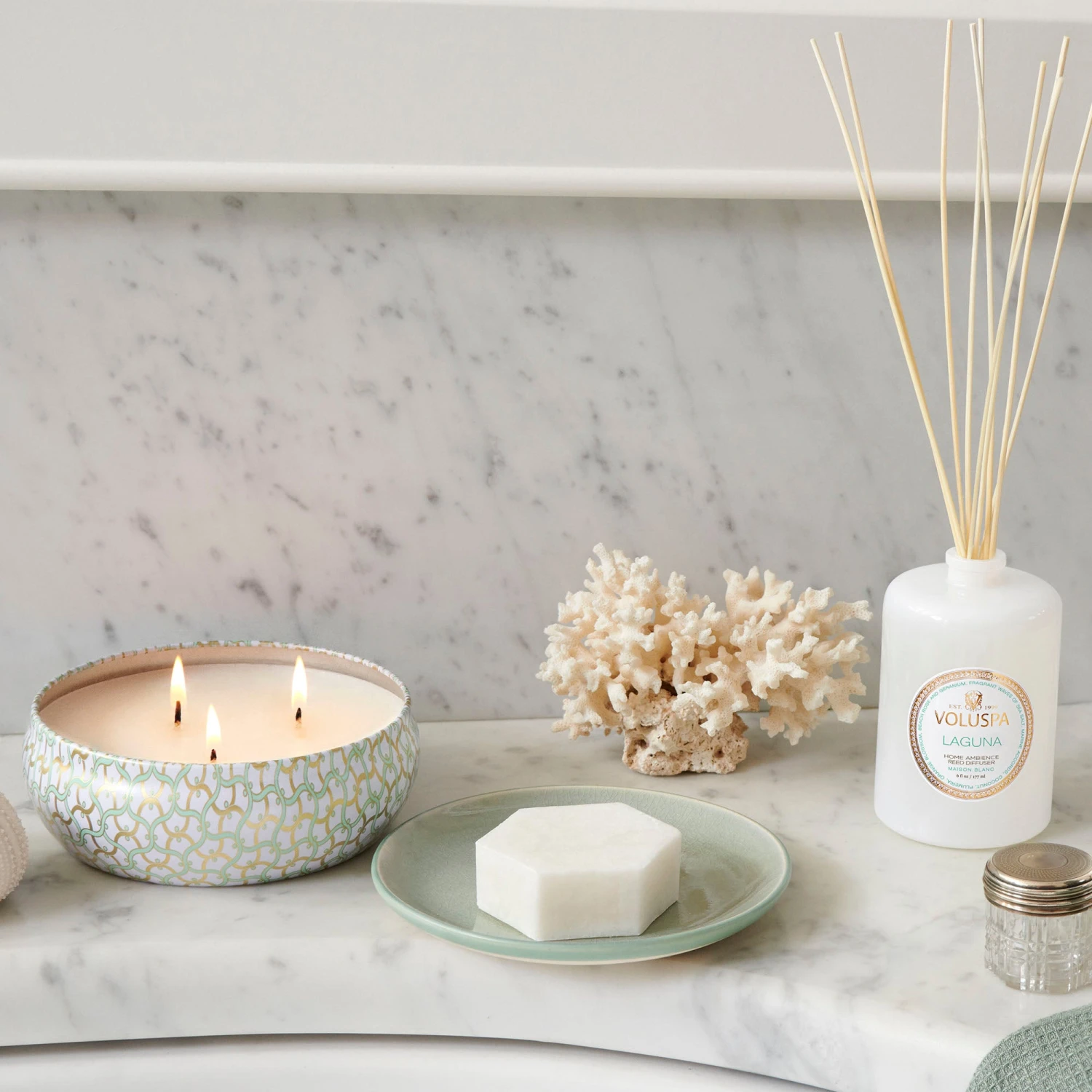 Voluspa’s unique coconut wax blend is hand-poured into a 12 oz. metal vessel adorned in Maison pattern and topped with a matching lid that keeps the candle dust-free when not in use. Our three wicks allow you to enjoy fragrance ample fragrance throw for 40 hours. Our candles are hand-poured in the United States and feature our proprietary, clean-burning coconut wax blend and 100% natural wicks. Our products are free of phthalates, pesticides, parabens and sulfates and are never tested on animals. Up-cycle this best seller into a keepsake after the last burn.Â