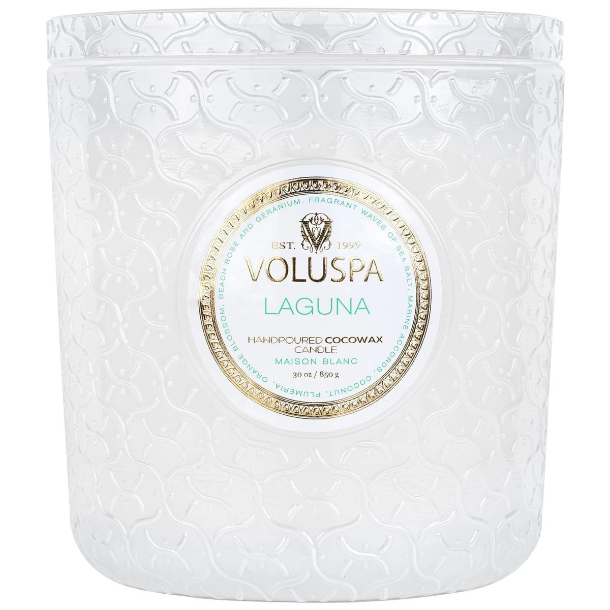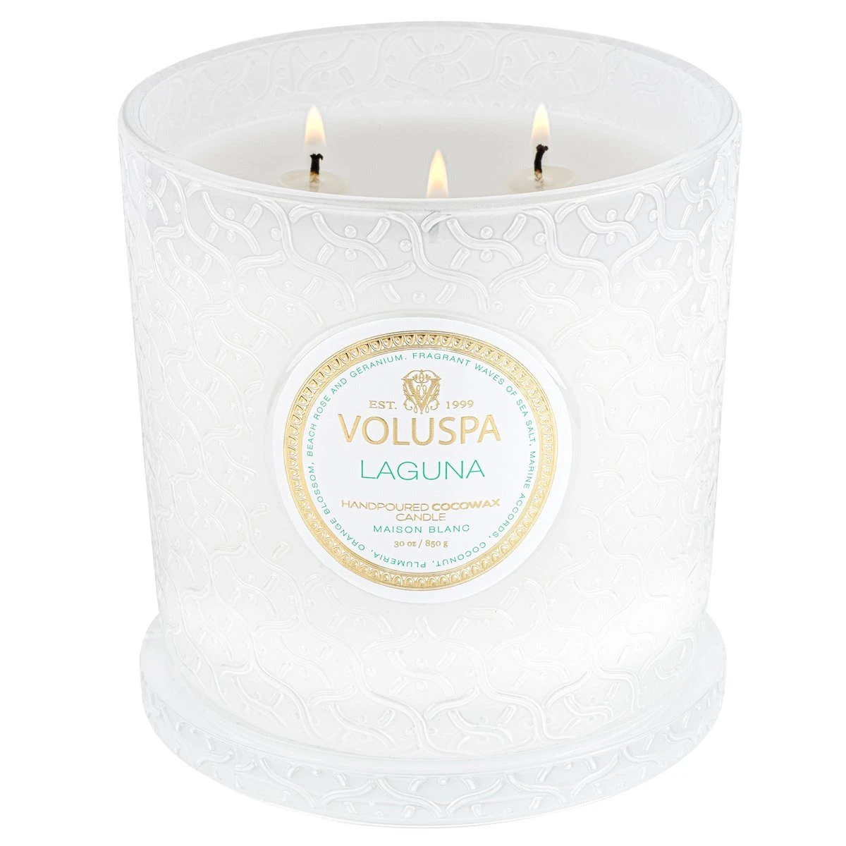 Voluspa Laguna Luxe Candle:Â Sink into the sensation of sunshine and sea salt spray. Fresh marine gives way to shoreline mist with a gentle ripple while garlands of plumeria blossom, island gardenia, orange blossom and coconut palms sway through the cloudless, azure sky.