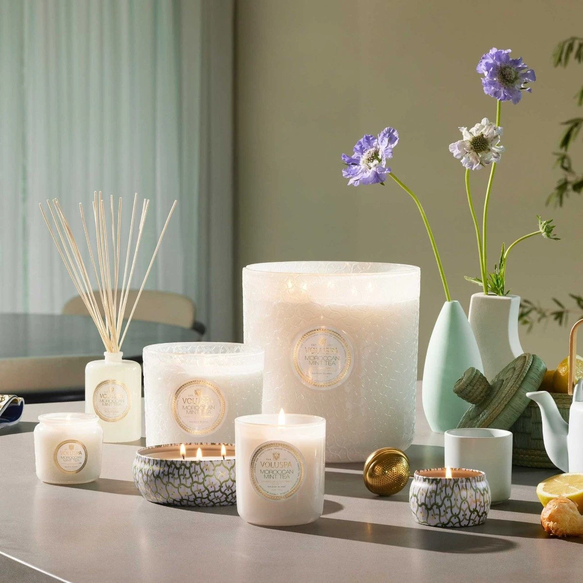 There is no shortage of luxury in our Maison Luxe Jar Candle. Voluspa’s signature Maison pattern wraps the vessel in an elegant emboss from base to lid. The triple wick configuration transforms the ambience with its reflective glow, creating a generous wax pool to ensure abundant fragrance throw. As a finishing touch, the candle is perfectly designed to fit in the depression of the lid when lit.