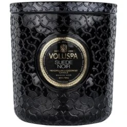 The Voluspa Roses Collection Classic Glass is textured with a classic geometric 3D cube pattern and colored to match the rose that served as fragrance and packaging inspiration.
