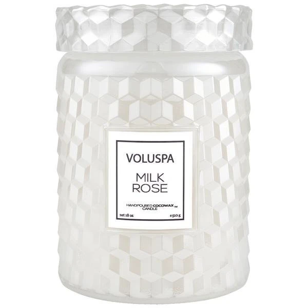 Voluspa Milk Rose Embossed Glass Candle is Bulgarian rose, marshmallow milk and white copali amber.