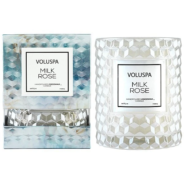 Voluspa Milk Rose Classic Candle, delicately sized for any space, is Bulgarian rose, marshmallow milk and white copali amber. An artistically designed candle glass and glass cover, the ultimate in functional beauty. Filled with 8.5 oz of scent inspired COCOWAX, this unique glass/cover duo is an instant upgrade to any space.Â