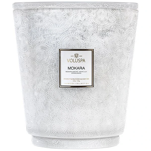 Voluspa Mokara 5 Wick Hearth Candle is like wandering through an island garden and exploring its meandering paths. Exotic blossoms of orchid, tuberose, freesia and white lily are edged with cooling moss, sheltered under the shade of citrus trees; all gathered in a sultry, tropical bouquet of scent – creating a breath of fresh island air.