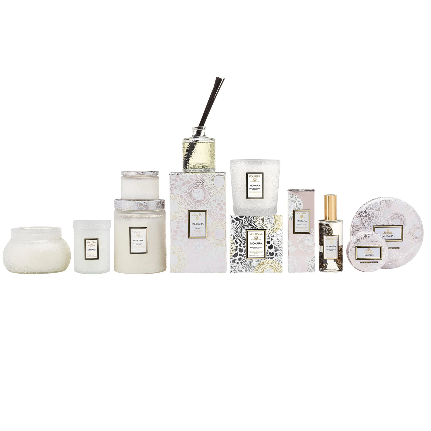 Voluspa’s unique coconut wax blend is hand-poured into a variety of vessels. Our candles are hand-poured in the United States and feature our proprietary, clean-burning coconut wax blend and 100% natural wicks. Our products are free of phthalates, pesticides, parabens and sulfates and are never tested on animals. Up-cycle these best sellers into keepsakes after the last burn. This fragrance collection includes (left to right): Chawan Bowl Candle, Small Jar Candle, Large Jar Candle, Petite Jar Candle, Reed Diffuser, Classic Candle, Room & Body Spray, Mini Tin Candle & 3 Wick Tin Candle.