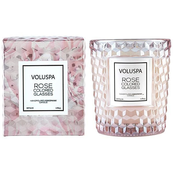 Voluspa Rose Colored Glasses Classic Candle, delicately sized for any space, is pink rose petals, neroli bloom, warm amber, musk and sweet vanilla.