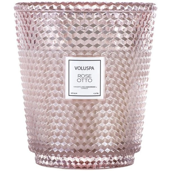 Voluspa Rose Otto 5 Wick Hearth Candle, with its impressive size, is steamed distilled Rosa Damascena flower tops, blended with Bulgarian rose essential oil.Â
