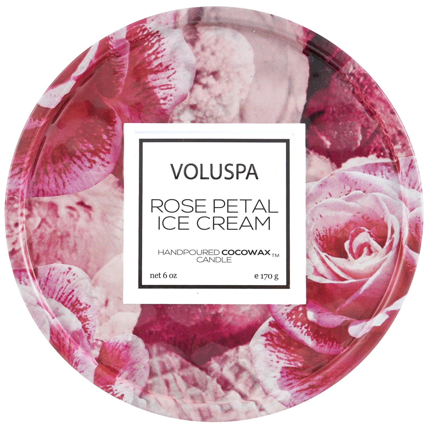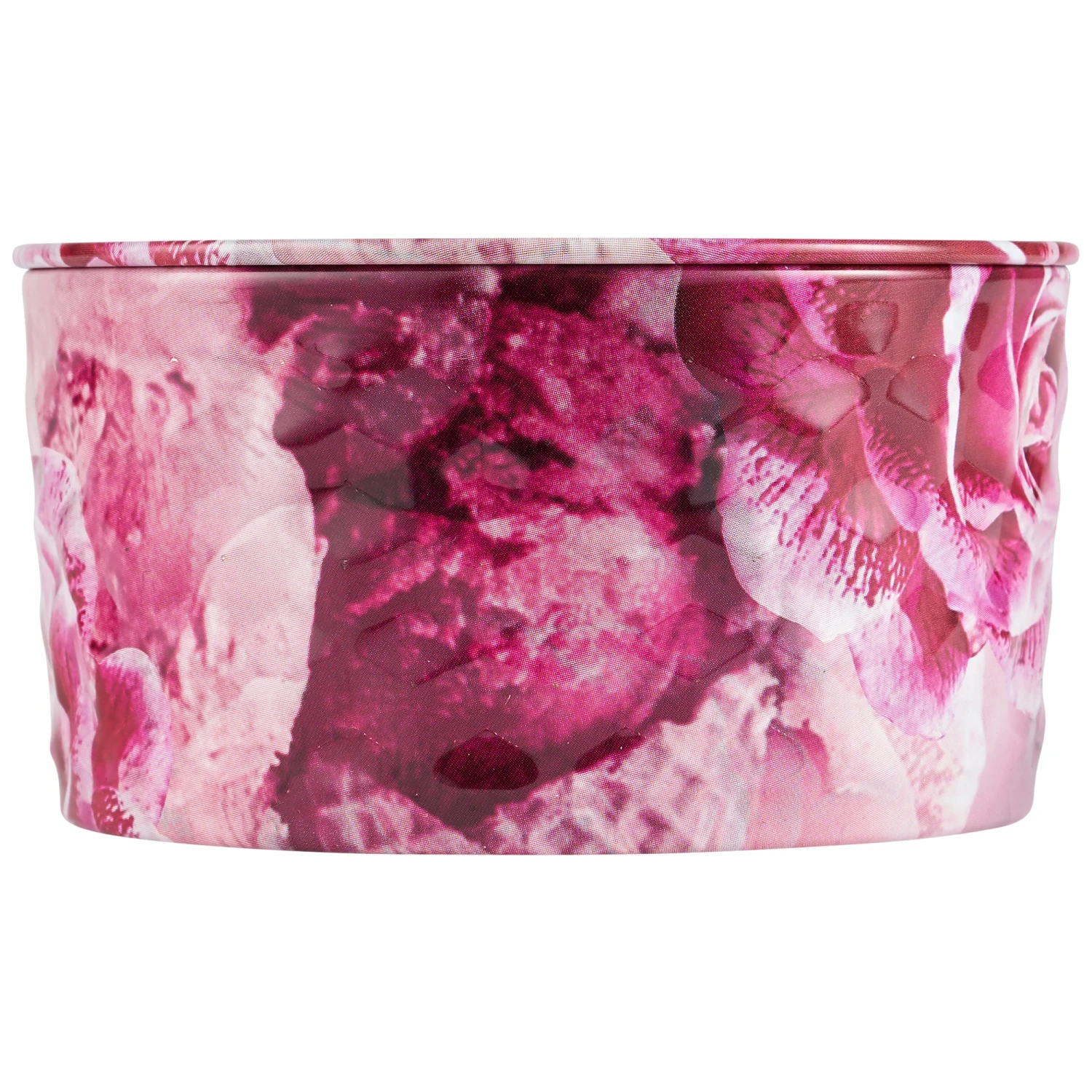 A tin candle completely embossed with a 3D geometric cube pattern and packaged to match the rose-inspired fragrance.
