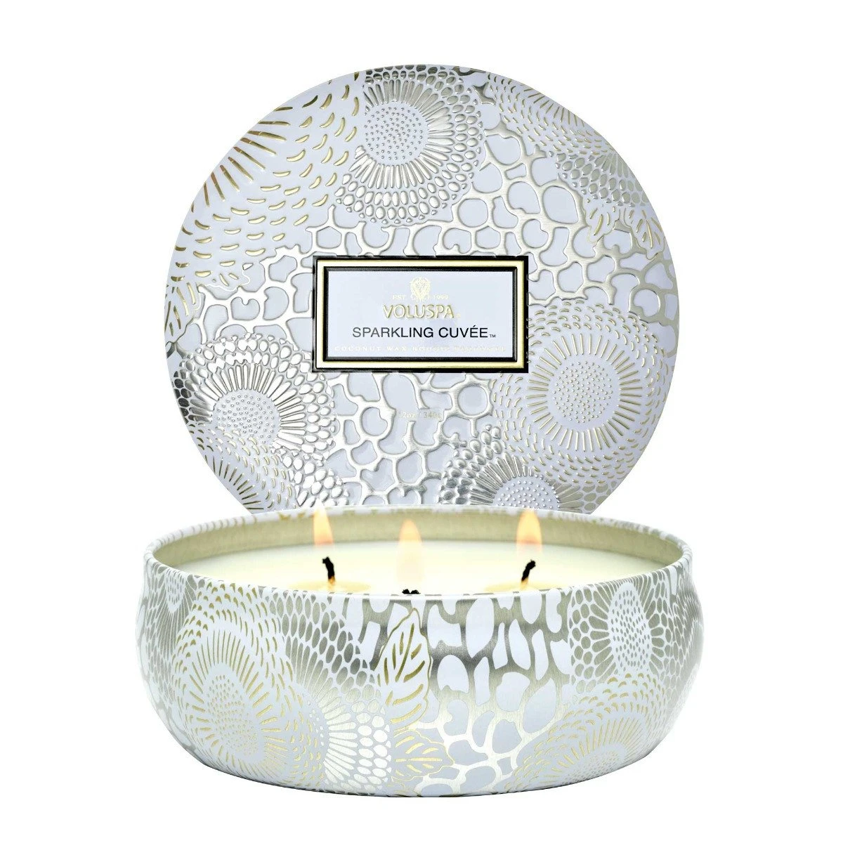 Voluspa Sparkling Cuvée 3 Wick Tin Candle: Pop a bottle of Voluspa’s finest blend, it’s time to celebrate! The effervescence of sparkling wine is the heart of the celebration, with bubbles cascading to the surface. Raise a glass of Sparkling Cuvée, you rolfactory aperitif for every unforgettable occasion. Notes of sparkling wine, pomelo and woody oak.