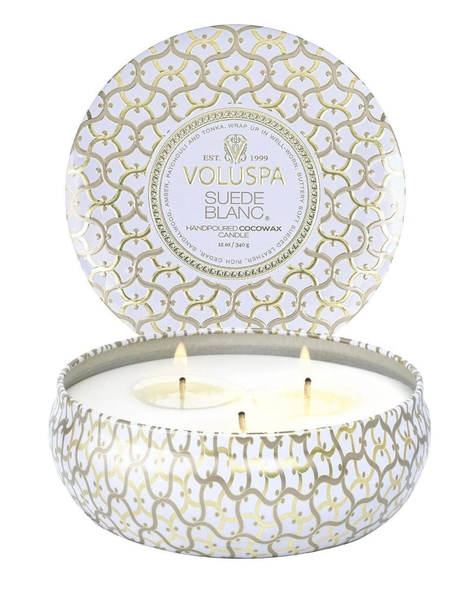 Voluspa Suede Blanc 3 Wick Tin Candle: Wrap up in a comfortable jacket of soft, supple well-worn suede. Low-key, mellow and infinitely smooth…its sultry caress envelops all in a veil of smooth sensuality. Suede Blanc is the accessory that complements any style.