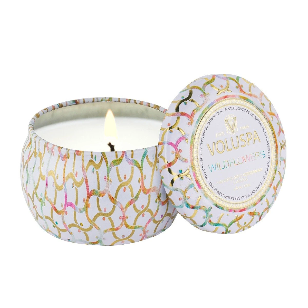 Voluspa Wildflowers Mini Tin Candle: You’ve been called to dance among the wildflowers, losing yourself in the beauty of this unruly floral sea. Lightly pass your hand over a kaleidoscope of native wildflowers, blooming golden poppy, ambrosia and springing herbs; sugared by misty vapors of blue agave and delicately kissed by the rising citron sun. Gently coax this fragrant super bloom of Voluspa’s Wildflowers.